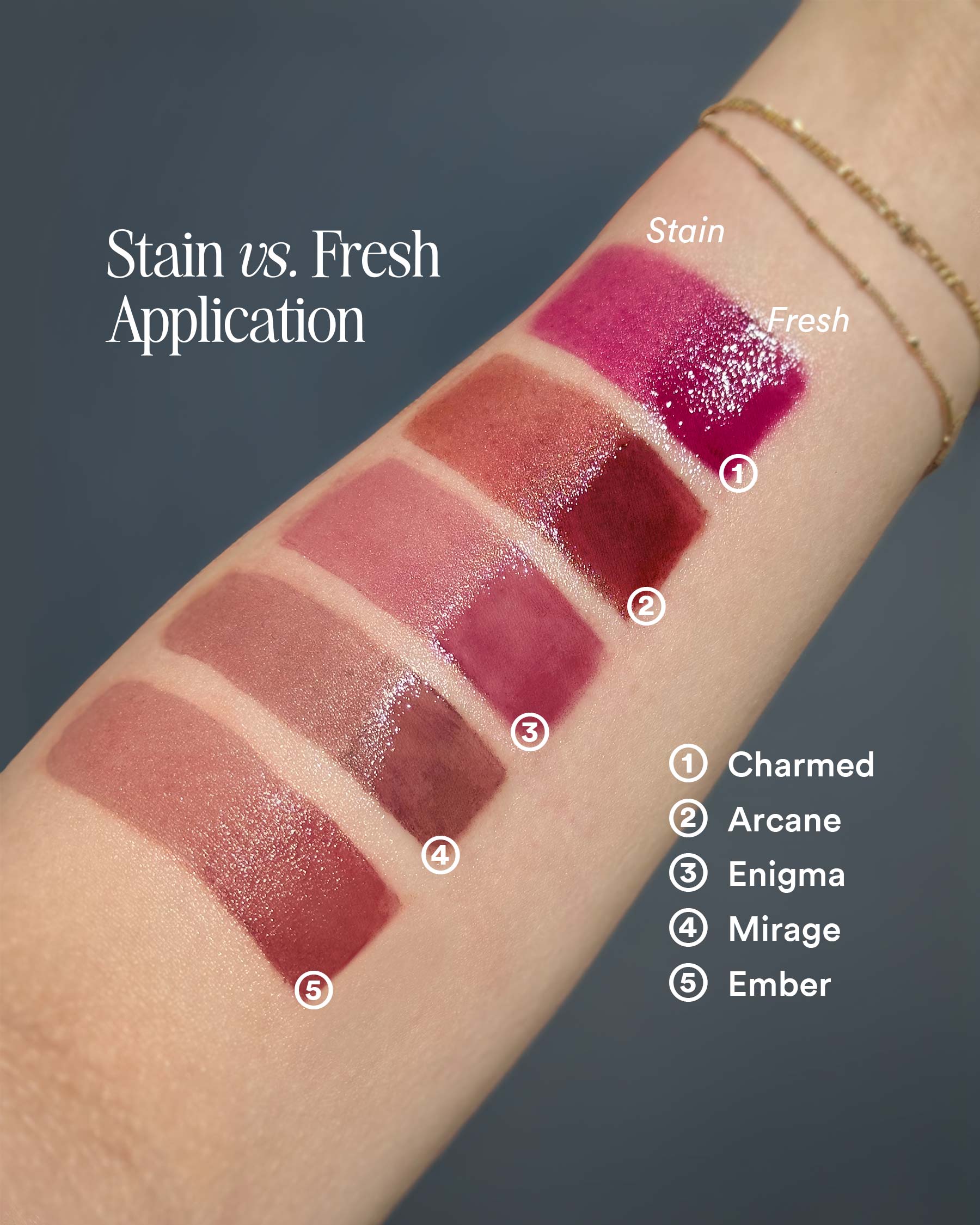 - Popsicle Lip: Use a lighter tone for a base color (Mirage or Enigma), add a deeper tone (Arcane or Charmed) in the center of the lips, continue to apply only on the center to deepen the look.
